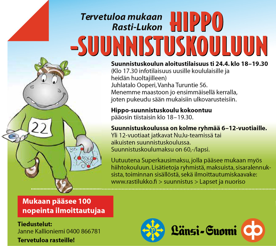 Tänä vuonna 12-vuotiaat ja nuoremmat voivat hankkia Superkausipassin, jolla pääsee sekä suunnistus- että hiihtokouluun. Yli 12-vuotiaat voivat osallistua uudelle aikuisten suunnistuskurssille. Hippo-suunnistuskoulu alkaa taas! Suunnistuskoulun aloitus on ensi tiistaina 24.4. kello 18 Juhlatalo Ooperissa, Vanha Turuntie 56. Uusien suunnistuskoululaisten vanhemmille on infotilaisuus samassa paikassa kello 17.30. Suunnistuskoulu kokoontuu pääosin tiistaisin kello 18. Suunnistuskoulumaksu on tänä vuonna 60 euroa. Uutuutena ostettavissa on Superkausimaksu, jolla pääsee myös talven hiihtokouluun. Sen hinta on 150 euroa (norm. suunnistuskoulu 60 e + hiihtokoulu 110 e). Lisätietoa hinnoista suunnistuskoulun sivuilta. Suunnistuskoulu on suunnattu 6-12-vuotiaille ja siinä on kolme ryhmää. Yli 12-vuotiaat voivat jatkaa Rasti-Lukon NuJu- (Nuorten Jukola) tiimiin tai uudelle aikuisten suunnistuskurssille. |